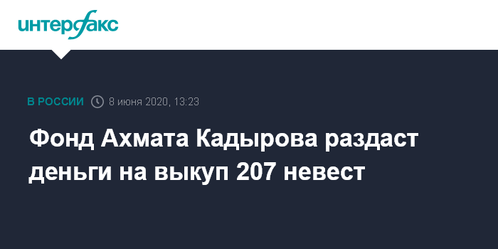 Москва. 8 июня. INTERFAX.RU - Фонд Ахмата Кадырова поможет 207 женихам, у которых из-за пандемии начались финансовые трудности, выкупить невест, сообщило Духовное управление мусульман Чечни. Фонд им предоставит на это деньги по поручению главы республики Рамзана Кадырова.