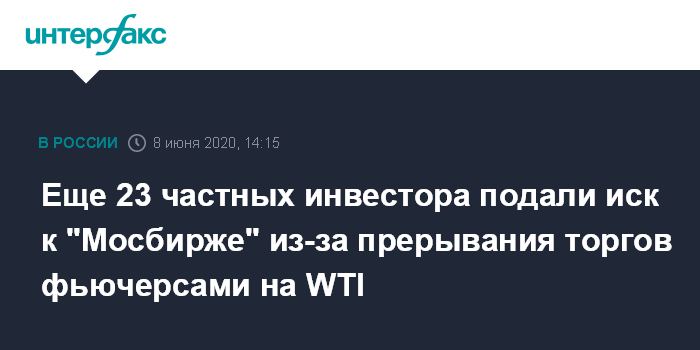 Москва. 8 июня. INTERFAX.RU - 23 частных инвестора подали коллективный иск к "Московской бирже" из-за приостановки торгов фьючерсами на нефть WTI 21 апреля и расчета контрактов по цене минус $37,63 за баррель, сообщило партнерство адвокатов и антикризисных управляющих Milton Legal. Иск подан в Пресненский суд Москвы 5 июня.