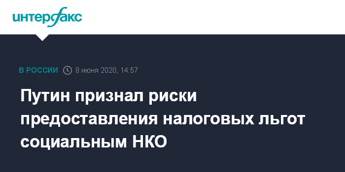 Москва. 8 июня. INTERFAX.RU - Предоставление налоговых льгот социальным некоммерческим организациям и помогающему им бизнесу создает риски, что этими послаблениями воспользуются нечистоплотные люди, допустил президент Владимир Путин.
