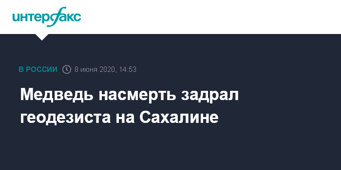 Москва. 8 июня. INTERFAX.RU - Медведь напал на геодезиста в Смирныховском районе в центральной части Сахалина в понедельник днем, мужчина погиб. Об этом сообщили "Интерфаксу" в администрации Смирныховского района.