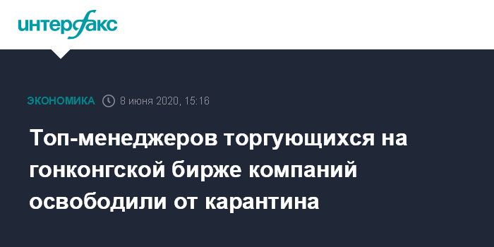 Москва. 8 июня. INTERFAX.RU - Администрация Гонконга отменила требование о двухнедельном карантине для приезжающих в город топ-менеджеров крупнейших компаний, акции которых торгуются на Гонконгской фондовой бирже. Об этом объявил министр финансовых услуг Гонконга Кристофер Хуэй.