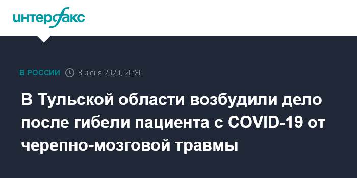 Москва. 8 июня. INTERFAX.RU - Губернатор Тульской области Алексей Дюмин на оперативном совещании в понедельник потребовал выяснить обстоятельства гибели мужчины, госпитализированного в больницу с подозрением на коронавирусную инфекцию и скончавшегося от черепно-мозговой травмы.