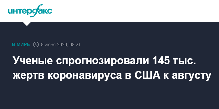 Москва. 9 июня. INTERFAX.RU - Число скончавшихся от COVID-19 в США к августу текущего года может достичь 145,7 тыс. человек, с таким прогнозом выступил Вашингтонский университет.
