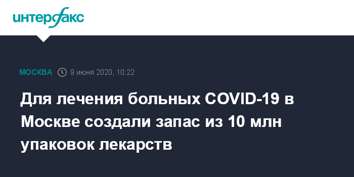 Москва. 9 июня. INTERFAX.RU - Для лечения пациентов с коронавирусной инфекцией в столице создан резерв медикаментов, включающий более 10 млн упаковок 53 антибактериальных, жаропонижающих и противовирусных препаратов, сообщила заместитель мэра Москвы по вопросам социального развития Анастасия Ракова журналистам во вторник.