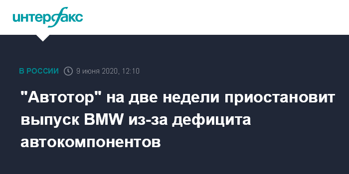 "Производство BMW будет приостановлено с середины июня и до конца месяца. Это связано с определенным дефицитом автокомпонентов, который возник из-за остановки этой весной заводов BMW в Европе и США", - сказал представитель компании со ссылкой на генерального директора "Автотора" Руслана Садыкова.