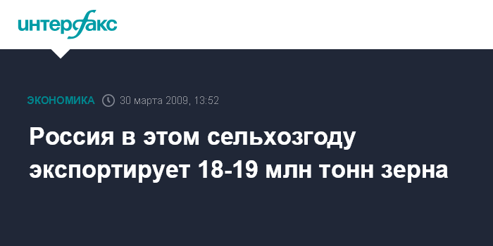 Москва. 30 марта. INTERFAX.RU - Россия в этом сельхозгоду (июль 2008-июнь 2009 г.) экспортирует 18-19 млн тонн зерна, сообщила министр сельского хозяйства РФ Елена Скрынник на расширенном заседании коллегии ведомства в понедельник в Москве.