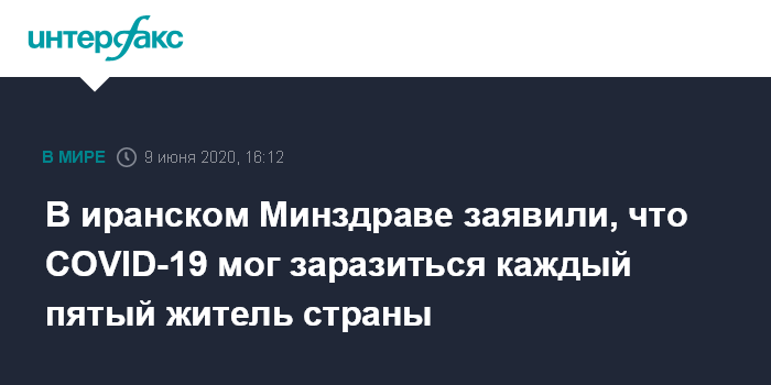 Москва. 9 июня. INTERFAX.RU - Около 15 млн иранцев, или каждый пятый житель страны, могли заразиться коронавирусом с февраля этого года, предположили во вторник в Минздраве Ирана.