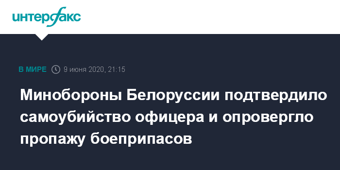 Москва. 9 июня. INTERFAX.RU - Офицер одной из воинских частей в Белоруссии совершил самоубийство, подтвердили в министерстве обороны страны.