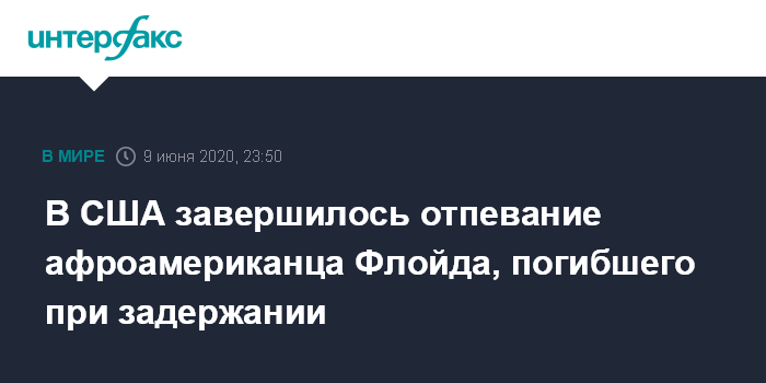 Москва. 9 июня. INTERFAX.RU - Церемония отпевания афроамериканца Джорджа Флойда, который две недели назад погиб от рук офицера полиции в Миннеаполисе (штат Миннесота), завершилась в Хьюстоне (штат Техас) - родном городе погибшего, сообщает телеканал CNN.