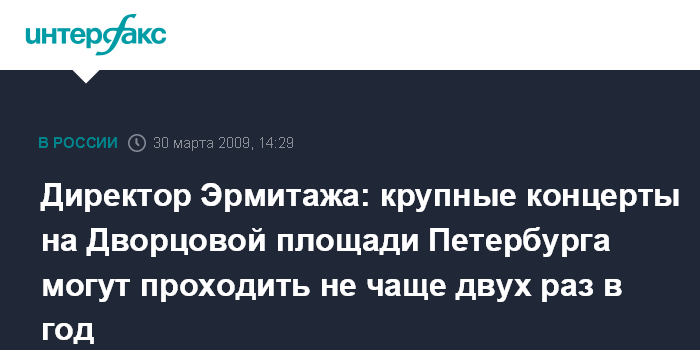 Пиотровский подчеркнул, что по данным исследований, проведенных музеем, крупные концерты могут проводиться на Дворцовой площади один-два раза в год. "У нас нет крупного стадиона, поэтому, не чаще двух раз в год, подобные мероприятия могут проходить на главной площади города без ущерба памятникам и Эрмитажу", - сказал директор музея.