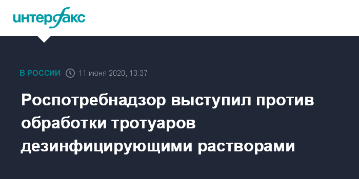 Москва. 11 июня. INTERFAX.RU - Роспотребнадзор считает бессмысленной, а в некоторых случаях даже вредной обработку тротуаров дезинфицирующими средствами в качестве профилактики от COVID-19, особенно в виде аэрозолей, заявила замглавы федеральной службы Ирина Брагина.