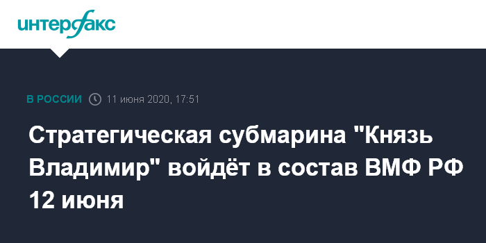 Москва. 11 июня. INTERFAX.RU - Военно-морской Флот (ВМФ) 12 июня, в День России, пополнится новейшим ракетным подводным крейсером стратегического назначения (РПКСН) проекта "Борей-А" "Князь Владимир", сообщает министерство обороны РФ.