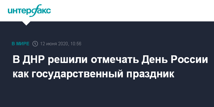 Москва. 12 июня. INTERFAX.RU - День России получил статус государственного праздника в самопровозглашенной Донецкой народной республике, заявил в пятницу глава ДНР Денис Пушилин.
