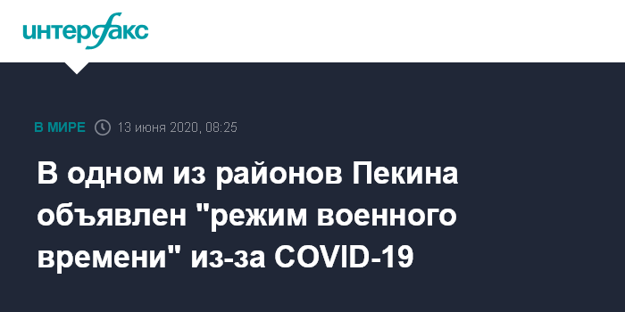 Москва. 13 июня. INTERFAX.RU - "Режим военного времени" объявлен в 11 микрорайонах района Фэнтай китайской столицы после того, как у пяти работников расположенного там оптового рынка "Синьфади" была диагностирована коронавирусная инфекция, сообщил исполняющий обязанности главы района Чу Цзюньвэй.