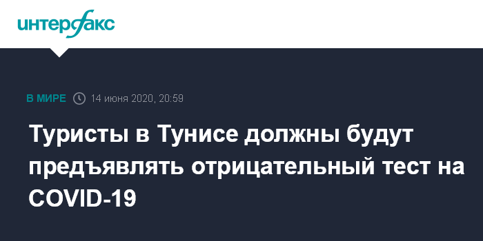 Москва. 14 июня. INTERFAX.RU - Туристы, прибывающие в Тунис с момента открытия границ, должны будут предоставить отрицательный тест на коронавирус, сообщает офис по туризму страны.