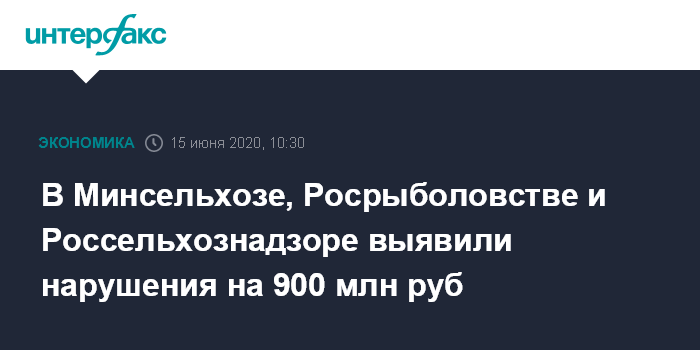 Москва. 15 июня. INTERFAX.RU - Счетная палата выявила в Минсельхозе и подведомственных ему Росрыболовстве и Россельхознадзоре нарушения на 900,7 млн рублей, сообщается в пресс-релизе по итогам проверки за 2019 год.