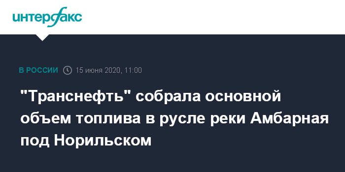 Москва. 15 июня. INTERFAX.RU - "Транснефть" собрала основную часть разлившегося дизельного топлива в русле реки Амбарная близ Норильска - 8,42 тыс. куб. метров, сообщила компания.