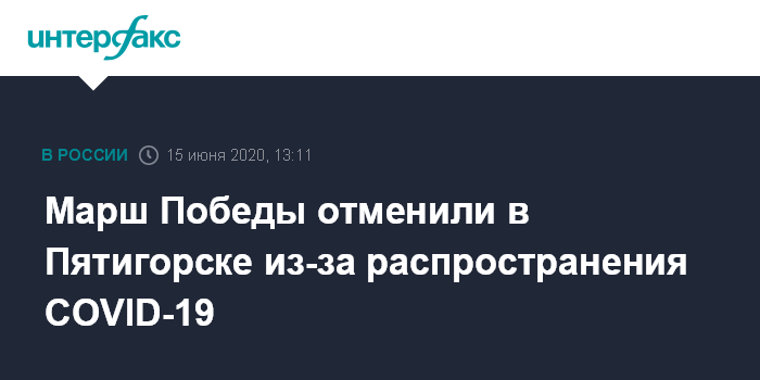 Москва. 15 июня. INTERFAX.RU - Марш Победы, который был запланирован на 24 июня в Пятигорске (Ставропольский край), отменен из-за неблагоприятной ситуации с коронавирусом, сообщила пресс-служба городской администрации.