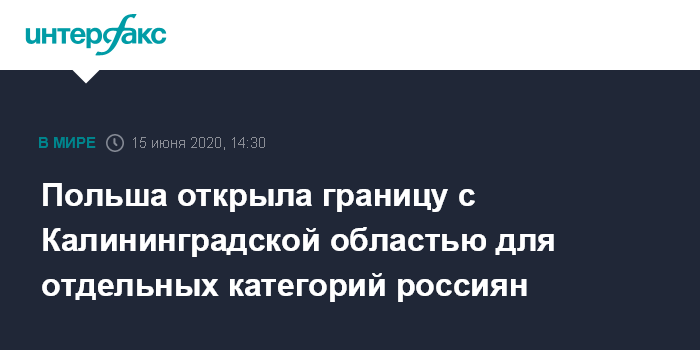 Москва. 15 июня. INTERFAX.RU - Польша открыла границу с Калининградской областью, но с ограничениями, говорится на сайте Варминско-Мазурского пограничного управления.