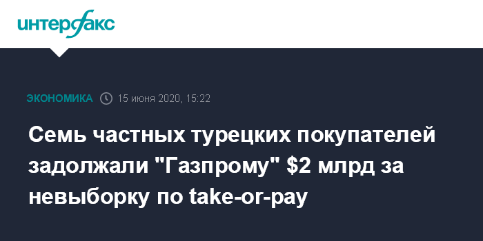 Москва. 15 июня. INTERFAX.RU - Частные турецкие импортеры по итогам 2019 года оказались должны "Газпрому" около $2 млрд за невыборку минимальных контрактных количеств (и этот долг в новом году только увеличивается), сообщает газета The Wall Street Journal