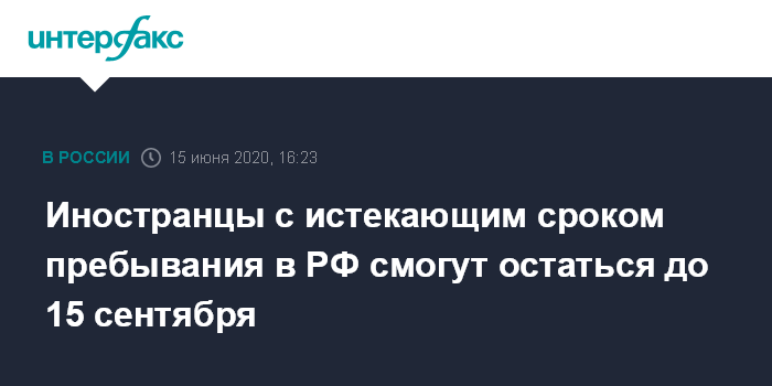 Москва. 15 июня. INTERFAX.RU - Президент РФ Владимир Путин подписал указ, который продлевает до 15 сентября возможность временного пребывания или постоянного проживания иностранцев и лиц без гражданства в РФ, если этот срок истекает.