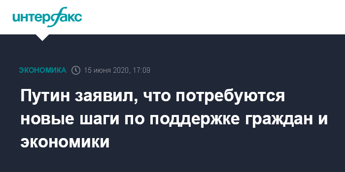 Москва. 15 июня. INTERFAX.RU - Президент РФ Владимир Путин поручил правительству проработать решения о продлении мер поддержки экономики после 1 июля.