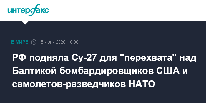Москва. 15 июня. INTERFAX.RU - Истребители Су-27 были подняты в воздух для сопровождения над Балтикой стратегических бомбардировщиков В-52H США и самолетов-разведчиков НАТО, сообщили в понедельник в Минобороны России.