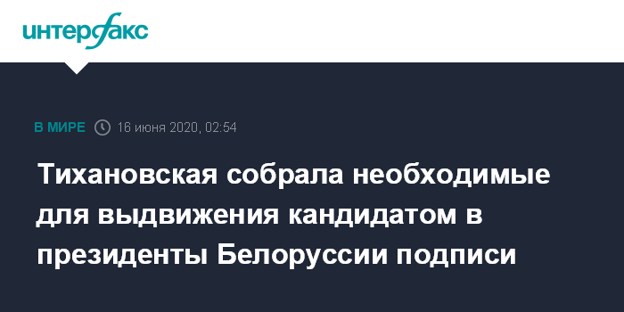 Москва. 16 июня. INTERFAX.RU - Претендент в президенты Белоруссии Светлана Тихановская заявила, что собрала необходимые для регистрации кандидатом 100 тысяч подписей.