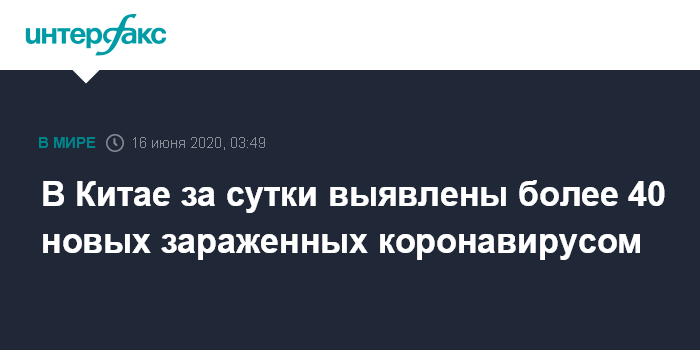 Москва. 16 июня. INTERFAX.RU - За истекшие сутки в Китае выявлены 46 новых случаев заражения коронавирусом, из них 40 больных в активной форме и шесть бессимптомных носителей, сообщил Госкомздрав КНР на своем официальном сайте.