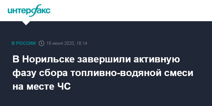 Москва. 16 июня. INTERFAX.RU - Спасатели МЧС завершили активную фазу сбора топливно-водяной смеси в Норильске, продолжаются работы по очистке малых водоёмов, сообщили "Интерфаксу" в пресс-службе МЧС России.
