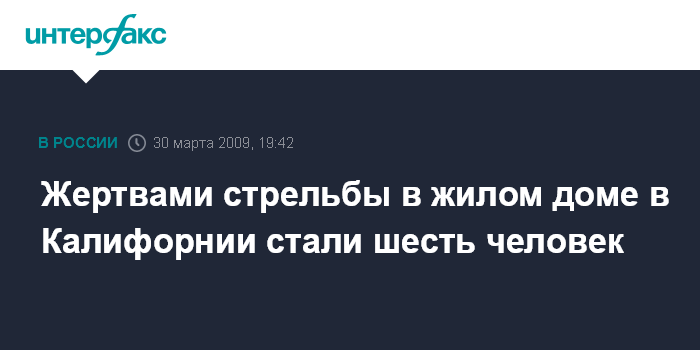 Вашингтон. 30 марта. INTERFAX.RU - В результате стрельбы, произошедшей в ночь на понедельник в жилом доме в американском городе Санта-Клара (штат Калифорния), шесть человек были убиты, включая троих детей, и еще один получил тяжелые ранения, сообщает американский телеканал CNN.