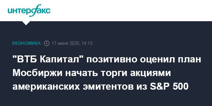 Москва. 17 июня. INTERFAX.RU - "ВТБ Капитал" позитивно оценил планы Мосбиржи начать торги акциями американских эмитентов из индекса S&P 500, о которых сообщил во вторник директор департамента рынка акций Мосбиржи Борис Блохин.