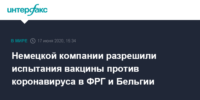Москва. 17 июня. INTERFAX.RU - Немецкие и бельгийские регуляторы разрешили компании из ФРГ CureVac испытания вакцины против коронавируса COVID-19 в Германии и Бельгии, сообщает в среду пресс-служба фирмы.