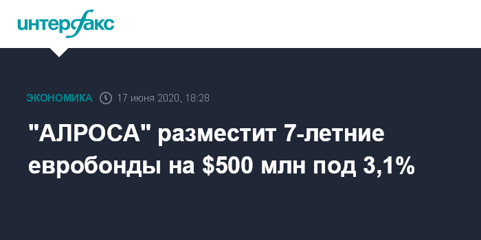 Москва. 17 июня. INTERFAX.RU - АК "АЛРОСА" размещает 7-летние еврооблигации на $500 млн под 3,1%, сообщил "Интерфаксу" источник в банковских кругах.
