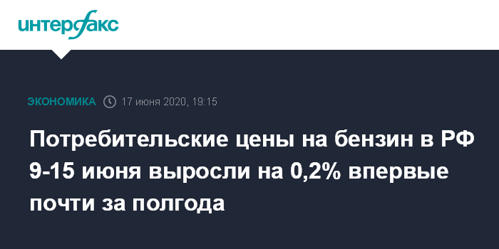 Москва. 17 июня. INTERFAX.RU - Потребительские цены на бензин в России с 9 по 15 июня выросли на 0,2% после роста на 0,1% неделей ранее и семи недель стабильность перед этим, сообщила в среду Федеральная служба государственной статистики (Росстат).