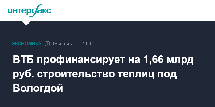 ВТБ профинансирует на 1,66 млрд руб. строительство теплиц под Вологдой