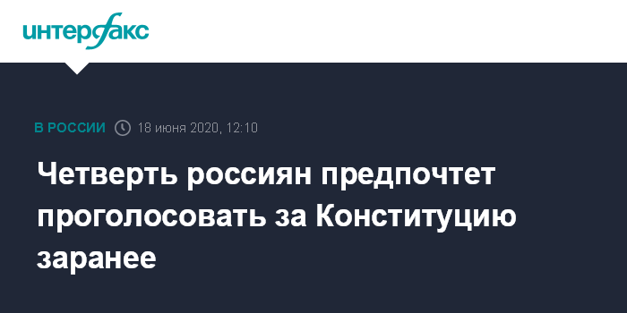 Москва. 18 июня. INTERFAX.RU - Проголосовать по поправкам в Конституцию 1 июля, в официальный день голосования, планируют 53% россиян, предпочтут это сделать заранее, с 25 по 30 июня - 25%, показал опрос ВЦИОМа, проведенный 15 июня 2020 года по телефону среди 1600 взрослых респондентов.