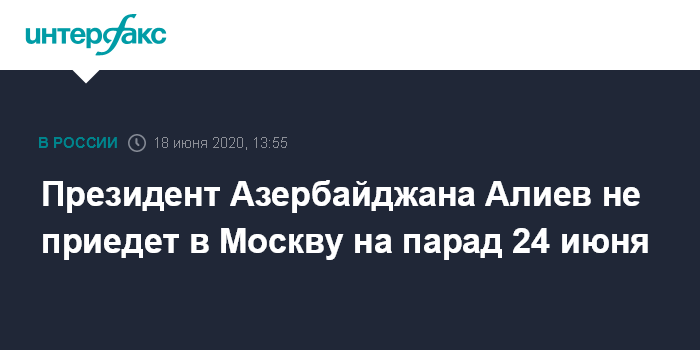 Москва. 18 июня. INTERFAX.RU - Президент Азербайджана Ильхам Алиев в телефонном разговоре с президентом РФ Владимиром Путиным с сожалением сообщил, что из-за карантина по коронавирусу не сможет приехать в Москву 24 июня на парад, посвященный 75-летию Победы в Великой Отечественной войне. Об этом сообщает в четверг пресс-служба азербайджанского лидера.