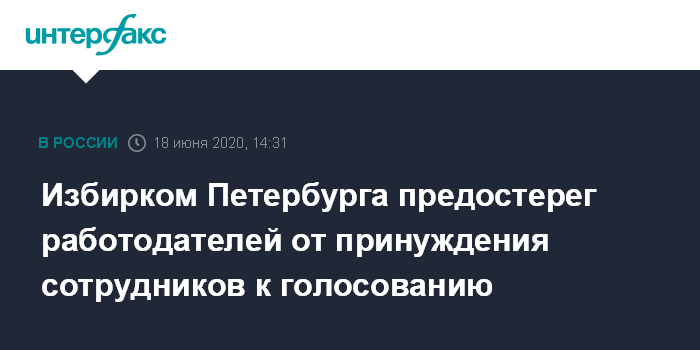 Москва. 18 июня. INTERFAX.RU - Санкт-Петербургская избирательная комиссия попросила чиновников Смольного разъяснить органам власти, что информирование о голосовании по поправкам в Конституцию исключает принуждение. Об этом сообщили в аппарате избиркома.