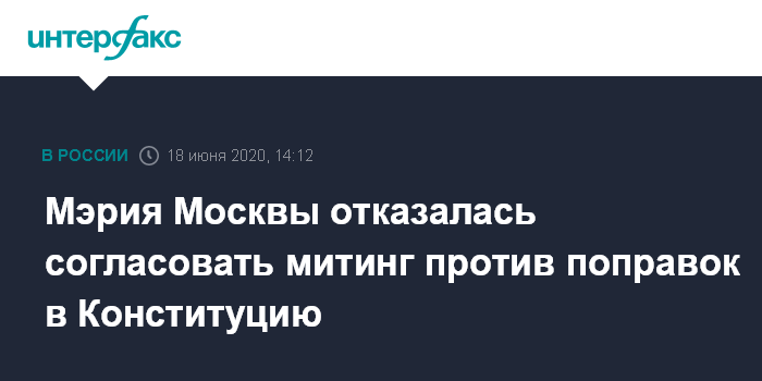 Москва. 18 июня. INTERFAX.RU - Мэрия Москвы отказала "Левому фронту" и КПРФ в согласовании намеченного на 27 июня митинга против поправок в Конституцию, сославшись на неблагоприятную санитарно-эпидемиологическую обстановку, рассказали "Интерфаксу" в пресс-службе движения.