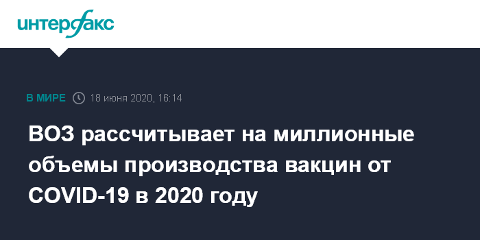 Москва. 18 июня. INTERFAX.RU - Во Всемирной организации здравоохранения (ВОЗ) в четверг выразили надежду на производство сотен миллионов доз вакцин против коронавируса COVID-19 уже в 2020 году.