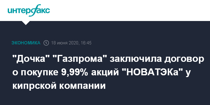 "Дочка" "Газпрома" заключила договор о покупке 9,99% акций "НОВАТЭКа" у кипрской компании