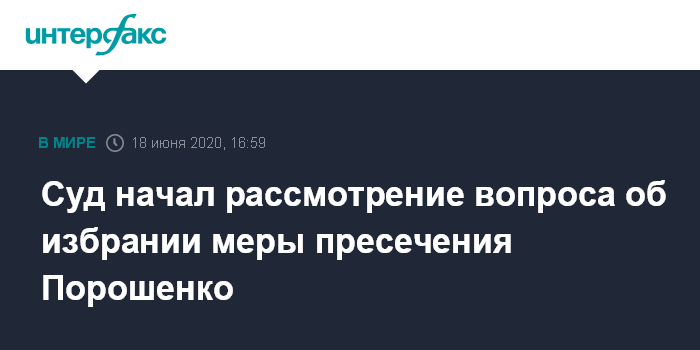 Москва. 18 июня. INTERFAX.RU - Печерский суд Киева начал заседание по рассмотрению ходатайства прокуратуры об избрании меры пресечения пятому президенту Украины, лидеру партии "Европейская солидарность" Петру Порошенко.