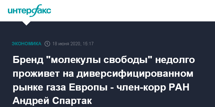 Москва. 18 июня. INTERFAX.RU - Политическая мотивация в выборе того или иного источника энергоресурсов (к примеру, США брендируют свой СПГ "молекулами свободы") на диверсифицированном европейском рынке не будет играть определяющей роли, заявил директор АО "Всероссийский научно-исследовательский конъюнктурный институт", член-корреспондент РАН Андрей Спартак.