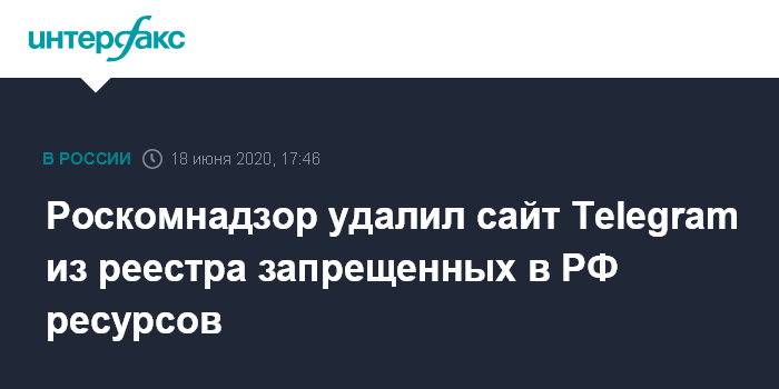 Москва. 18 июня. INTERFAX.RU - Роскомнадзор исключил ранее блокировавшийся на территории РФ сайт telegram.org из реестра запрещенной в стране информации.