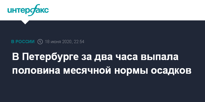 Москва. 18 июня. INTERFAX.RU - Мощный грозовой фронт накрыл Санкт-Петербург в четверг вечером, в городе за два часа выпало 23,5 мм осадков при расчетной июньской норме 59,6 мм, сообщается на сайте городского Водоканала.
