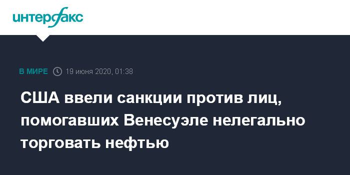 Москва. 19 июня. INTERFAX.RU - Минфин США объявил в четверг о решении распространить санкции против трех иностранных физлиц, восьми компаний и двух танкеров, через которых Каракас пытался торговать нефтью в обход американских ограничительных мер.