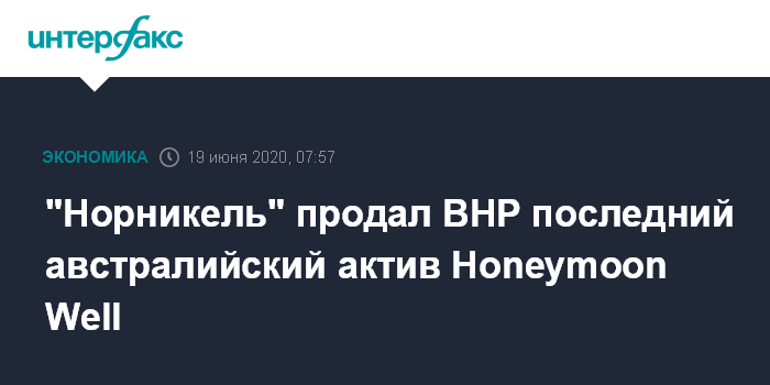 Москва. 19 июня. INTERFAX.RU - "Норильский никель" продал свой австралийский greenfield Honeymoon Well, последний проект в этой стране и один из немногих оставшихся в портфеле компании зарубежных активов.