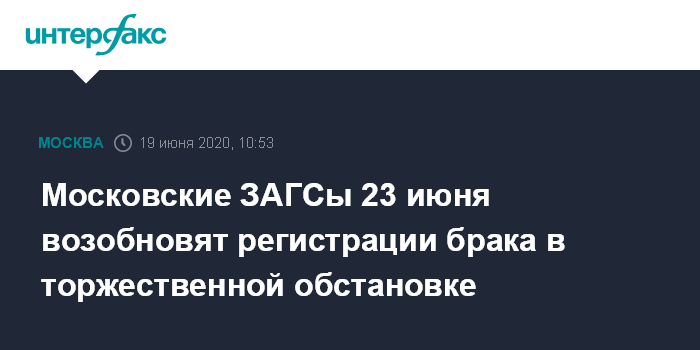 Москва. 19 июня. INTERFAX.RU - Московские отделы ЗАГС и дворцы бракосочетания с 23 июня возобновят проведение торжественных церемоний заключения брака, сообщила заммэра столицы по вопросам социального развития Анастасия Ракова журналистам в пятницу.