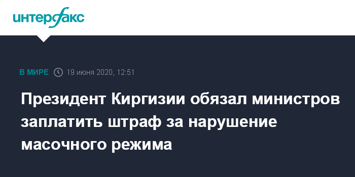 Москва. 19 июня. INTERFAX.RU - Президент Киргизии Сооронбай Жээнбеков потребовал от членов правительства республики заплатить штраф за несоблюдение масочного режима и безопасной дистанции по коронавирусу, сообщает в пятницу пресс-служба главы государства.